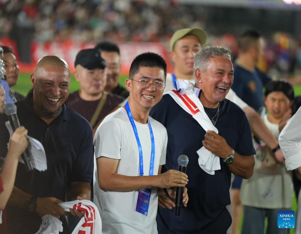Roberto Baggio (R) and Roberto Carlos (L) attend the "Village Super League," also known as Cun Chao, staged in Rongjiang County, Guizhou Province in southwest China, July 26, 2025. (Photo by Long Jianrui/Xinhua)