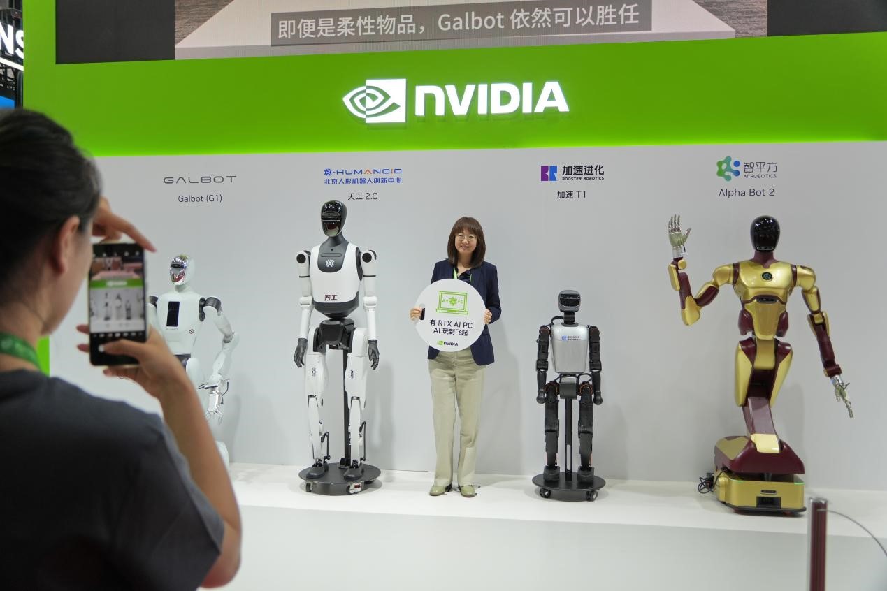 A visitor poses for a picture with humanoid robots at the exhibition booth of NVIDIA at the third China International Supply Chain Expo, Beijing, July 17, 2025. (Photo by Tang Ke/People's Daily Online)