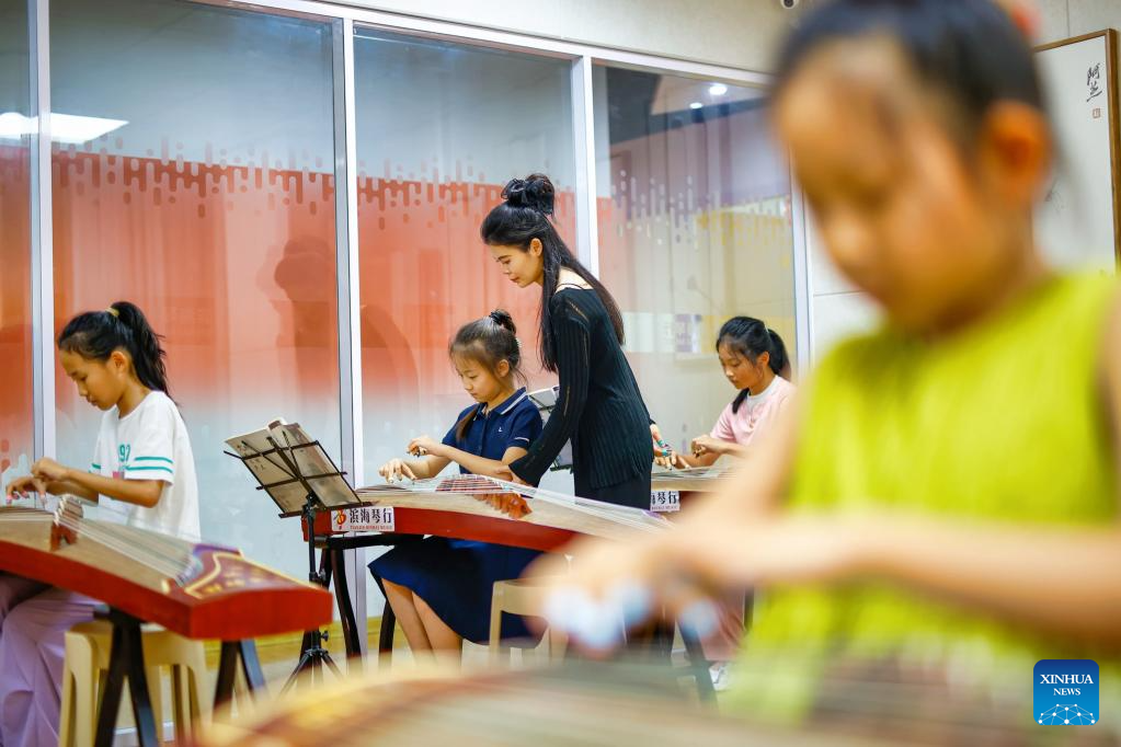 Children learn playing Guzheng, a traditional Chinese musical instrument, under the guidance of a teacher in north China's Tianjin, July 26, 2025. Children participate in various activities during summer vacation across the country. (Photo by Du Penghui/Xinhua)