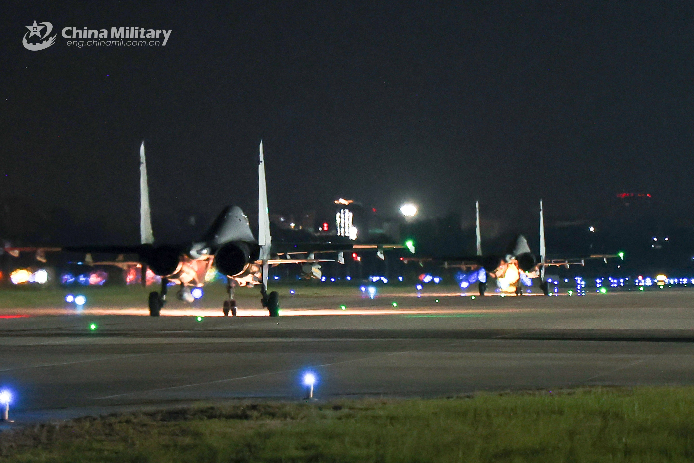J-16 fighter jets attached to an aviation brigade with the air force under the Chinese PLA Eastern Theater Command taxi on the runway during a nighttime flight training exercise in early July, 2025. (eng.chinamil.com.cn/Photo by Zheng Hanyi)