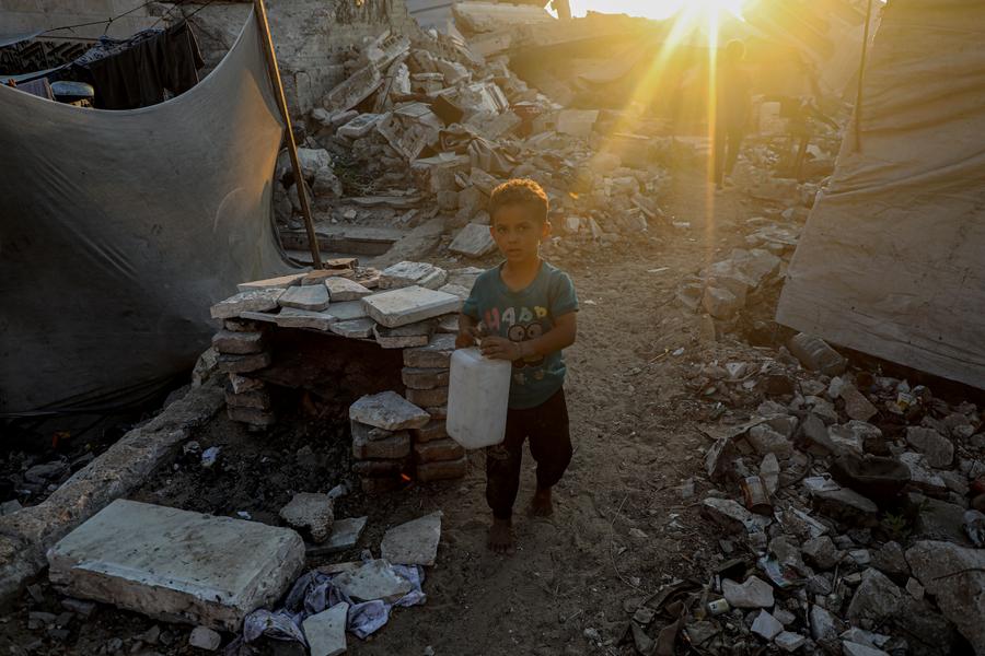 A displaced Palestinian child is seen at a shelter in the west of Gaza City on July 26, 2025. (Photo by Rizek Abdeljawad/Xinhua)