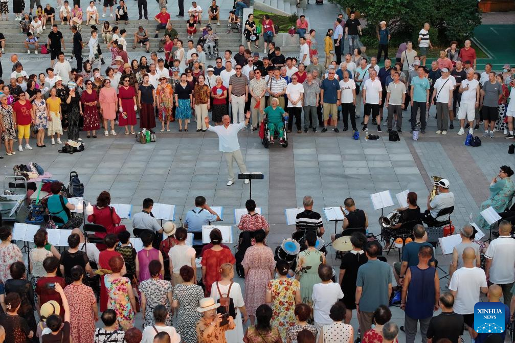 A drone photo taken on July 25, 2025 shows people watching a folk choir performance by the Songhua River in Harbin, northeast China's Heilongjiang Province.