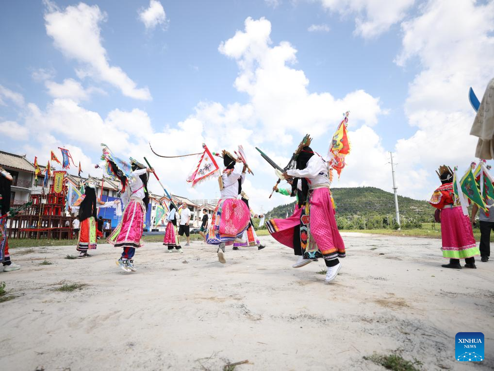 Actors stage a Dixi opera performance at the Miaoling Tunpu scenic area in Xixiu District of Anshun City, southwest China's Guizhou Province, Aug. 2, 2025. Anshun Dixi Opera is an important part of Tunpu culture dating back to the Ming Dynasty (1368-1644). The opera has been listed as a national intangible cultural heritage item in 2006. (Photo by Fan Hui/Xinhua)