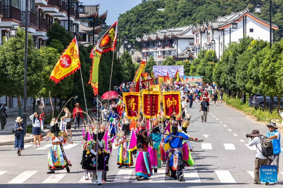 Actors take part in a Dixi opera parade at the Miaoling Tunpu scenic area in Xixiu District of Anshun City, southwest China's Guizhou Province, Aug. 2, 2025. Anshun Dixi Opera is an important part of Tunpu culture dating back to the Ming Dynasty (1368-1644). The opera has been listed as a national intangible cultural heritage item in 2006. (Photo by Chen Xi/Xinhua)