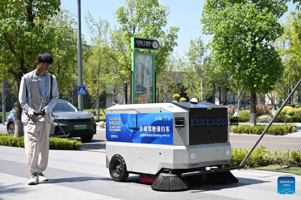 A staff operates an autonomous cleaning vehicle in the TWG village for The World Games (TWG) 2025 Chengdu in Chengdu, southwest China's Sichuan Province, Aug. 3, 2025. (Xinhua/Xu Bingjie)