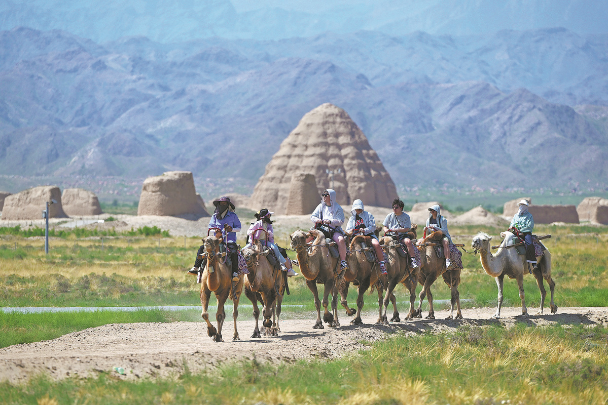 Visitors ride camels to tour the Xixia Imperial Tombs in Yinchuan, Ningxia Hui autonomous region, on July 13. Since the tombs were inscribed on the World Heritage List, the scenic spot has seen a tourism boom, with tourists from across the country flocking to experience the charm of Chinese civilization and enjoy the summer holidays. YUAN HONGYAN/FOR CHINA DAILY