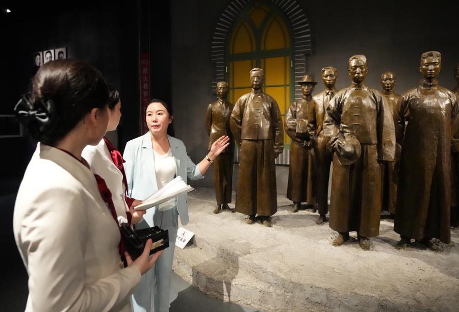 Shi Renhua (1st R) instructs docents attending a speech contest in Dadong District of Shenyang, northeast China's Liaoning Province, July 22, 2025. (Xinhua/Li Gang)