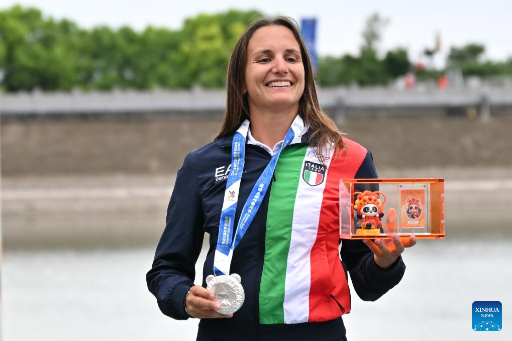 Silver medalist Alice Virag of Italy reacts during the awarding ceremony for the women's wakeboard freestyle of Waterski & Wakeboard event at The World Games 2025 in Chengdu, southwest China's Sichuan Province, Aug. 10, 2025. (Xinhua/Chen Zhenhai)