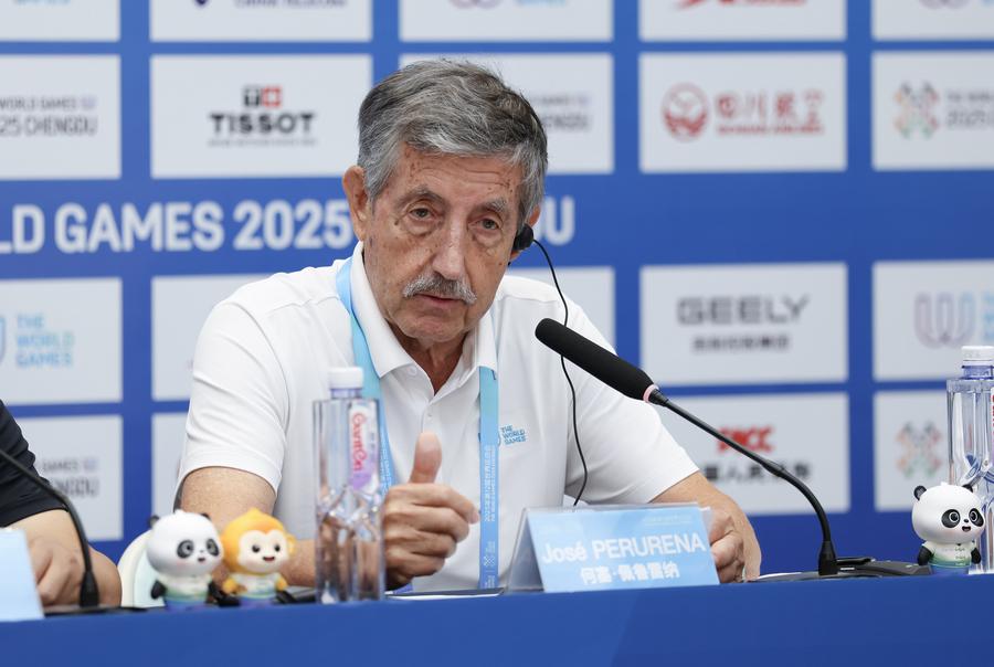 International World Games Association (IWGA) President Jose Perurena attends a press conference in Chengdu, southwest China's Sichuan Province, Aug. 11, 2025. (Xinhua/Bai Xuefei)