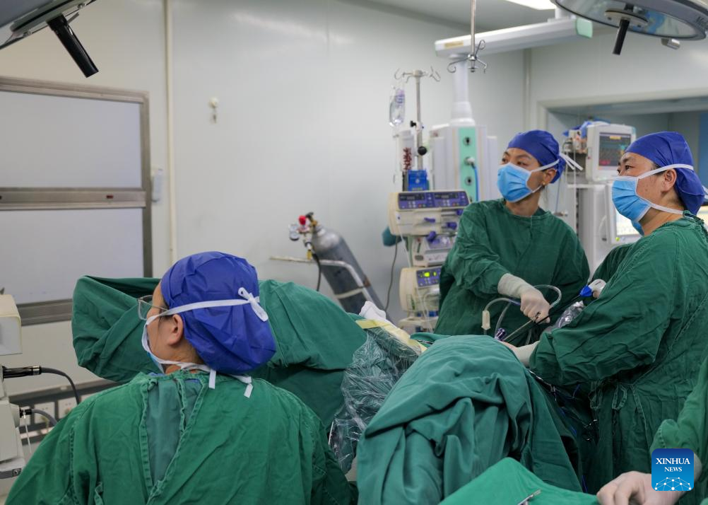 Doctors from Beijing and Lhasa perform a surgery on a patient at a hospital in Lhasa, southwest China's Xizang Autonomous Region, Aug. 5, 2025. Since 2015, 203 hospitals from 17 provinces and cities nationwide have deployed over 2,000 experts in teams to assist medical institutions in Xizang, training 5,536 local medical staff in the region. (Xinhua/Jiang Fan)