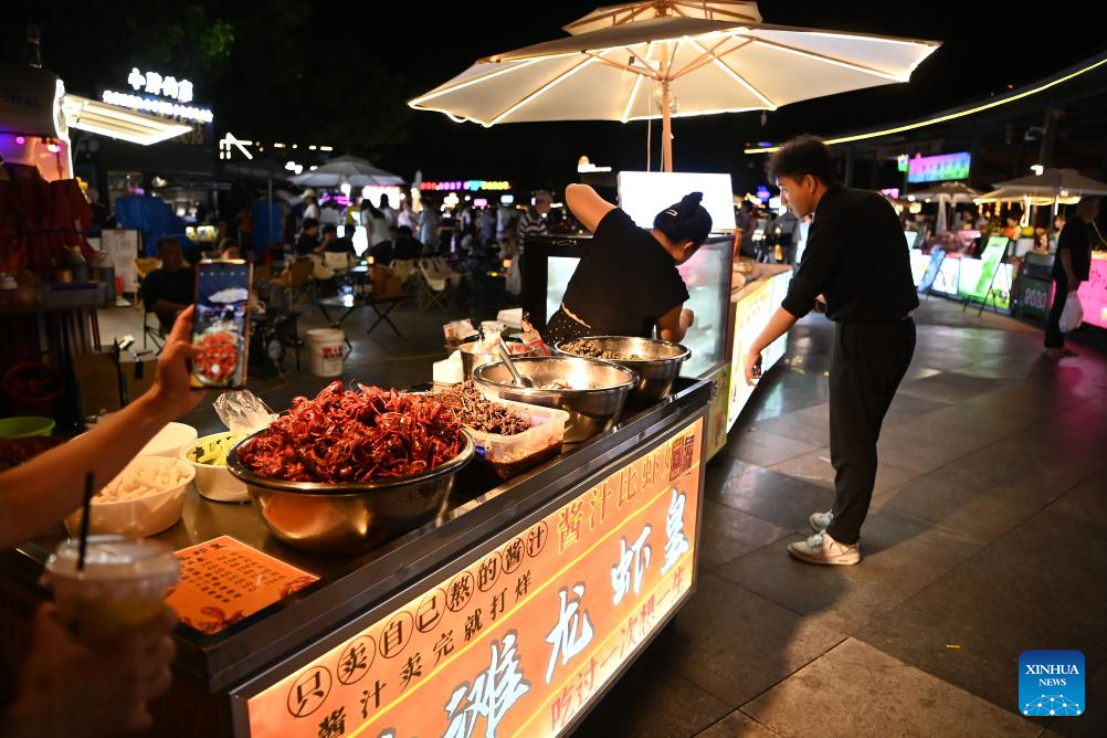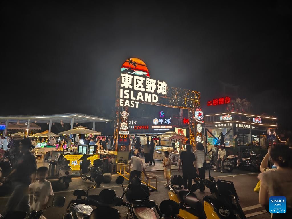 This photo taken on Aug. 18, 2025 shows a night market in Quanzhou City, southeast China's Fujian Province. In Quanzhou City of Fujian Province, a 6-kilometer "Coastal Romance Route" stretches from Zhenwu Temple to the picturesque Xunpu Village. The coastal route, comprising five commercial districts, seven tourist attractions and over 200 distinctive restaurants, offers a vibrant cultural and tourism experience for both tourists and residents. (Xinhua/Xiao Xiao)