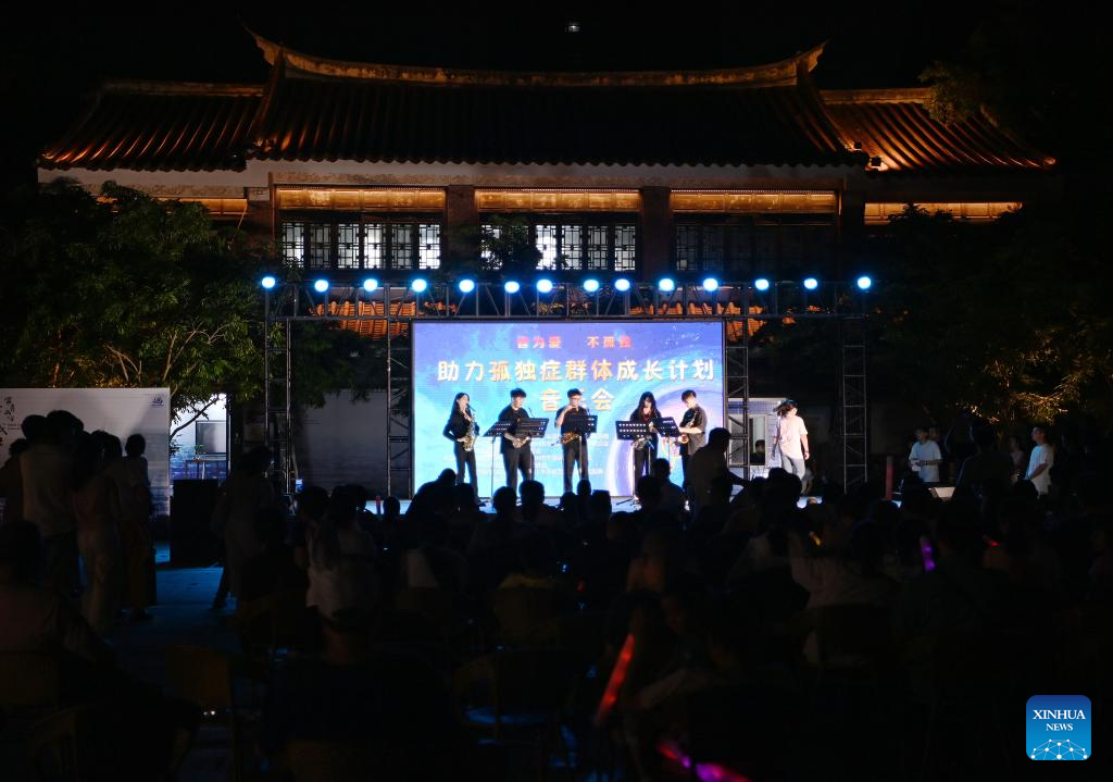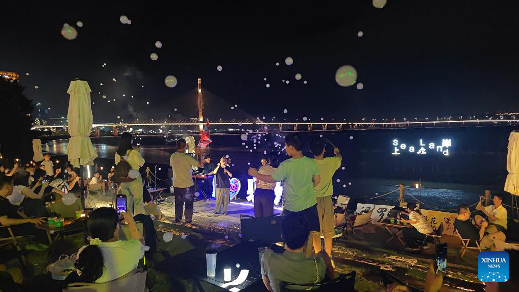 People watch a concert in Quanzhou City, southeast China's Fujian Province, Aug. 18, 2025. In Quanzhou City of Fujian Province, a 6-kilometer "Coastal Romance Route" stretches from Zhenwu Temple to the picturesque Xunpu Village. The coastal route, comprising five commercial districts, seven tourist attractions and over 200 distinctive restaurants, offers a vibrant cultural and tourism experience for both tourists and residents. (Xinhua/Xiao Xiao)