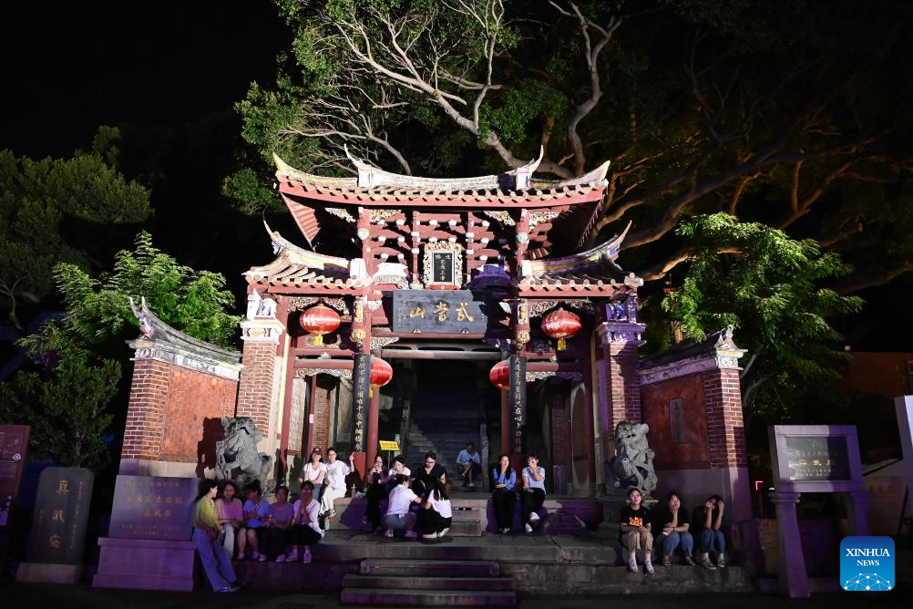 People take a rest at the gate of Zhenwu Temple in Quanzhou City, southeast China's Fujian Province, Aug. 18, 2025. In Quanzhou City of Fujian Province, a 6-kilometer "Coastal Romance Route" stretches from Zhenwu Temple to the picturesque Xunpu Village. The coastal route, comprising five commercial districts, seven tourist attractions and over 200 distinctive restaurants, offers a vibrant cultural and tourism experience for both tourists and residents. (Xinhua/Xiao Xiao)