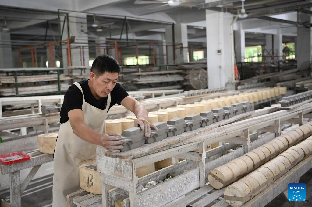 A worker is pictured at a workshop of Quanzhou Shunmei Group Co., Ltd. in Dehua County, southeast China's Fujian Province, Aug. 20, 2025. Dehua, a county with centuries of ceramic-making history and famed for its white porcelain, is home to over 4,500 ceramic-making enterprises, selling products to more than 190 countries and regions worldwide. To promote Dehua ceramics, the county has established 54 exhibition centers in Belt and Road partner countries and key cities. From January to July this year, the county's ceramic exports has exceeded 2.138 billion yuan (about 297.9 million U.S. dollars) and the ceramic industry cluster has reached a scale of 41.61 billion yuan (about 5.797 billion U.S. dollars), representing a 5.06 percent and 6.8 percent year-on-year increase respectively. (Xinhua/Lin Shanchuan)