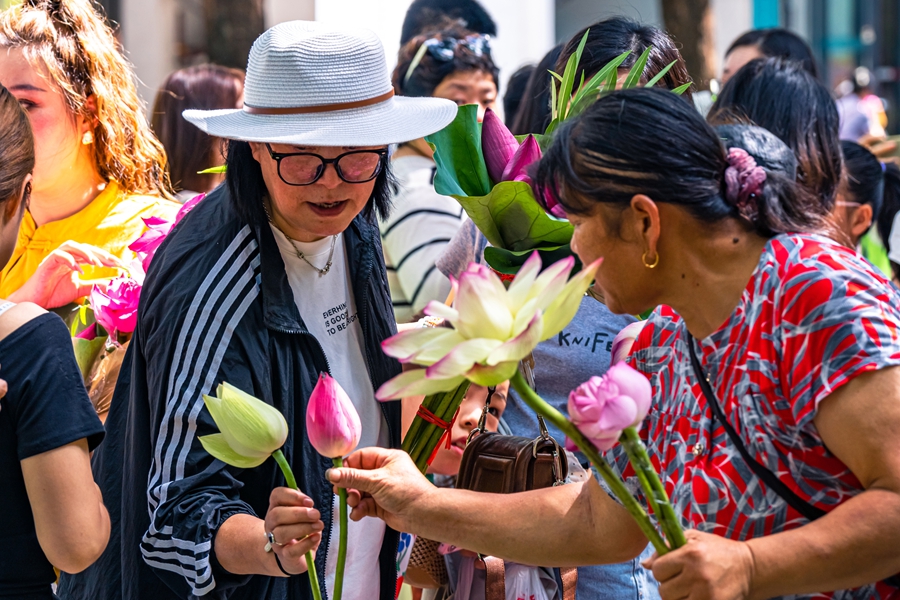 People purchase lotus flowers at a market on Baita West Road in Gusu district, Suzhou, east China's Jiangsu Province, Aug. 14, 2025. (Photo/Zhang Feng)