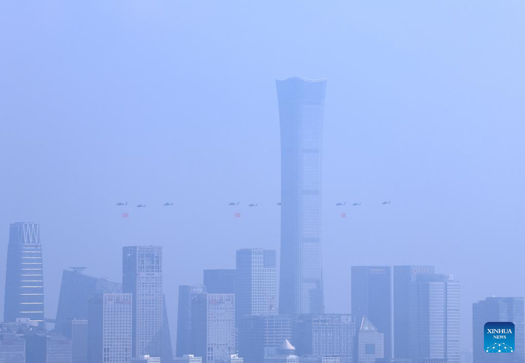 The flag-guarding air echelon flies over Tian'anmen Square during a grand gathering to commemorate the 80th anniversary of the victory in the Chinese People's War of Resistance against Japanese Aggression and the World Anti-Fascist War in Beijing, capital of China, Sept. 3, 2025. (Xinhua/Yang Guanyu)