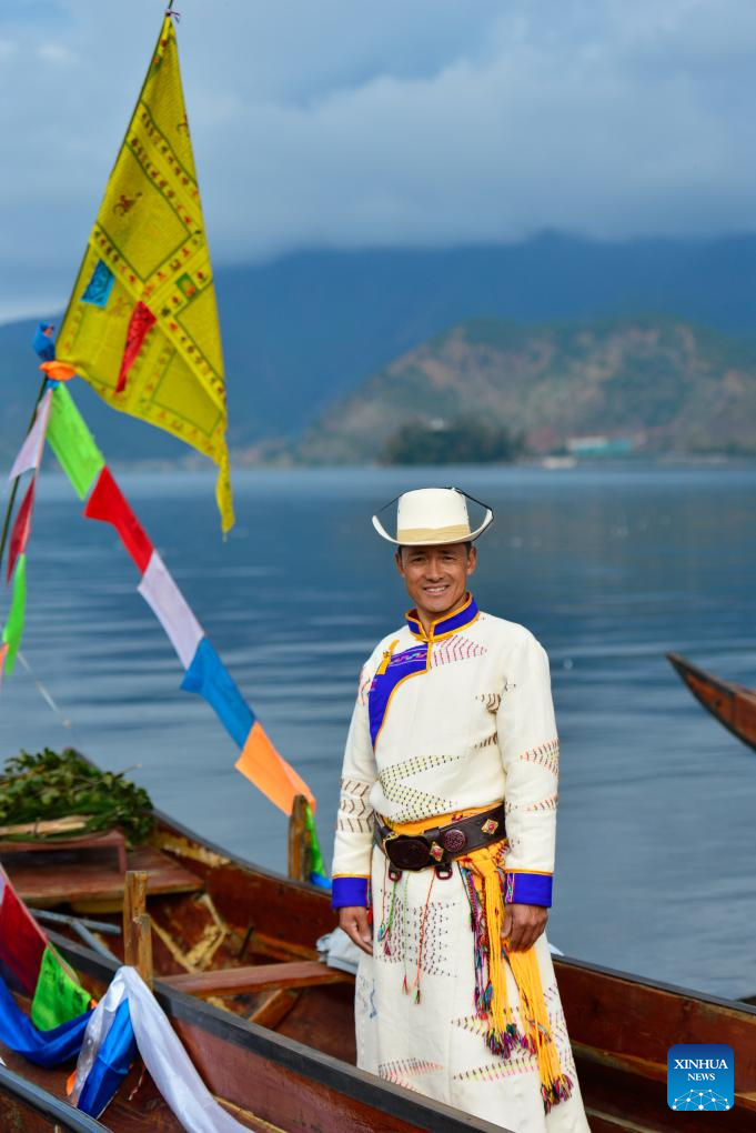A local man dressed up prepares to circle the lake by boat in Yanyuan County of Liangshan Yi Autonomous Prefecture, southwest China's Sichuan Province, Sept. 16, 2025. The first mountain and lake circling festival of Lugu Lake kicked off at Liangshan Yi Autonomous Prefecture on Tuesday. Mountain and lake circling is an important folk custom of the Mosuo people living near Lugu Lake. Starting this year, Liangshan Prefecture has officially designated the 25th day of the seventh lunar month as the mountain and lake circling festival, making it a local statutory holiday. Residents of Yanyuan and Muli counties can enjoy a one-day exclusive holiday. (Xinhua/Jiang Hongjing)