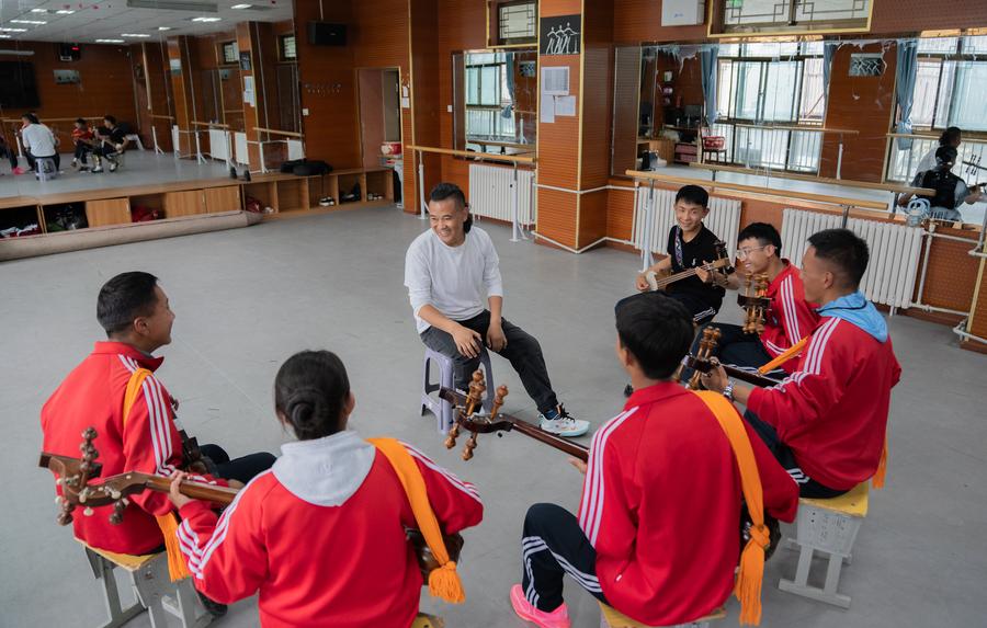 A teacher teaches students the playing skills of Zhanian, a traditional Tibetan stringed instrument, at a secondary vocational and technical school in Lhasa, southwest China's Xizang Autonomous Region, Sept. 9, 2025. (Xinhua/Zhang Xiaoyu)