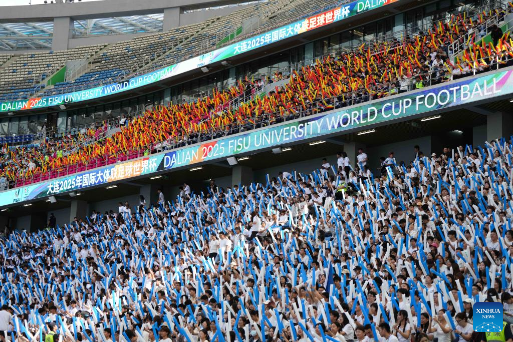 Spectators cheer during the opening ceremony of the 2025 FISU University World Cup Football held in Suoyuwan Stadium in Dalian, northeast China's Liaoning Province, Sept. 17, 2025. (Xinhua/Zheng Huansong)