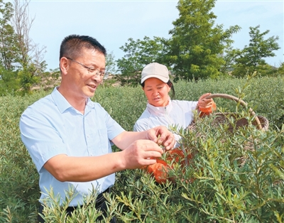 Liang Fan (left) shows a villager how to pick sea buckthorn leaves in Huachi county, Qingyang city, northwest China's Gansu Province. (People's Daily Overseas Edition/Song Chaojun)