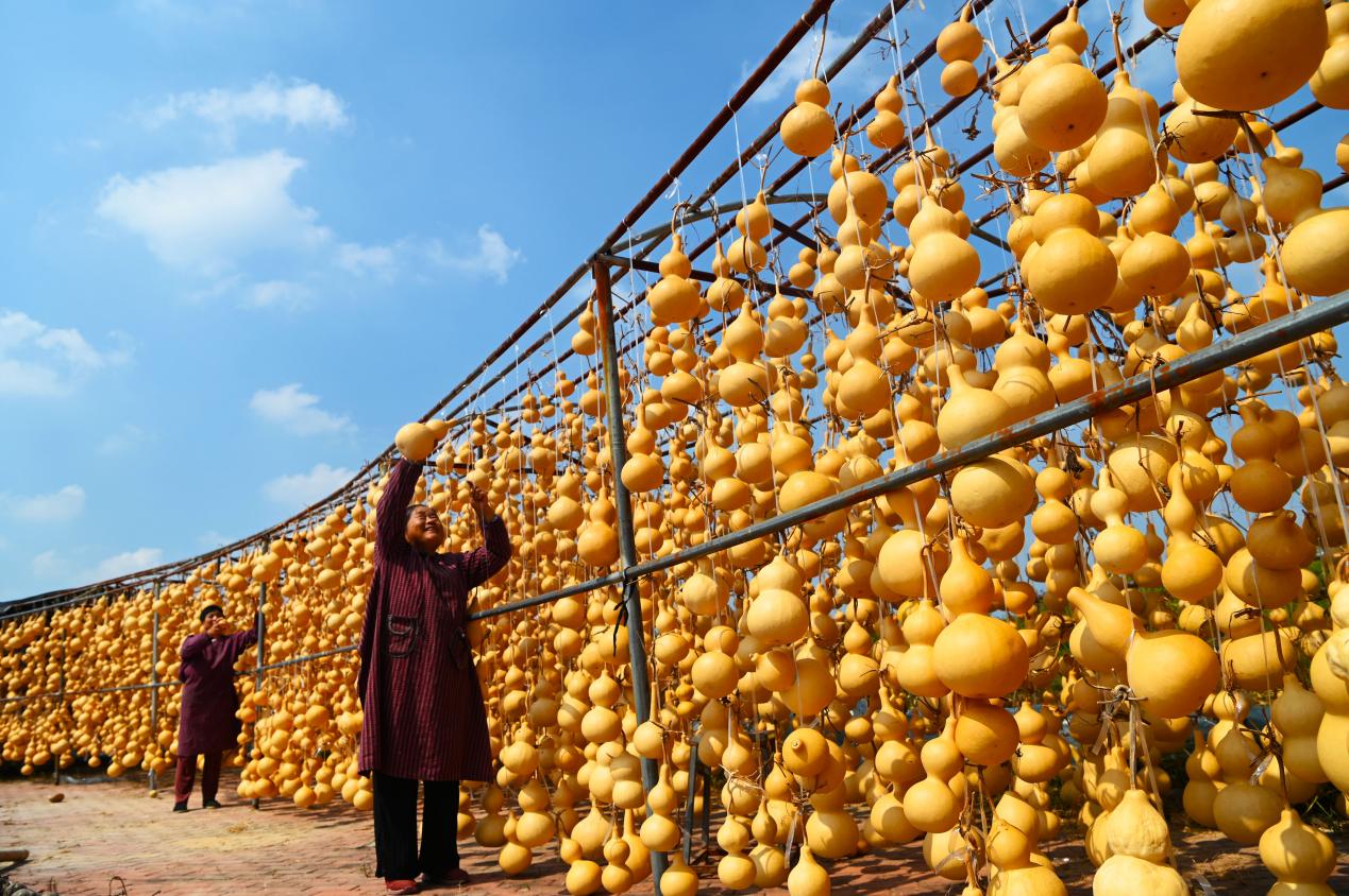 Each autumn, villagers are seen peeling and drying gourds in Luzhuang village, Tangyi town, Dongchangfu district of Liaocheng city, east China's Shandong Province. Along the streets, shops display and sell a wide variety of gourd handicrafts.