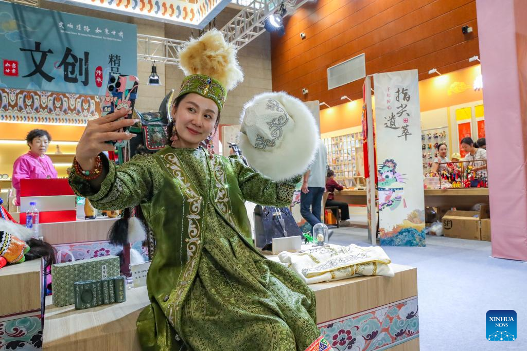 A visitor wearing traditional ethnic attire takes selfie at an exhibition during the 8th Silk Road (Dunhuang) International Cultural Expo in Dunhuang, northwest China's Gansu Province, Sept. 22, 2025. More than 1,200 representatives from 97 countries and eight international organizations have gathered at the 8th Silk Road (Dunhuang) International Cultural Expo, which kicked off on Sunday in Dunhuang, a key hub on the ancient Silk Road in northwest China. (Xinhua/Lang Bingbing)