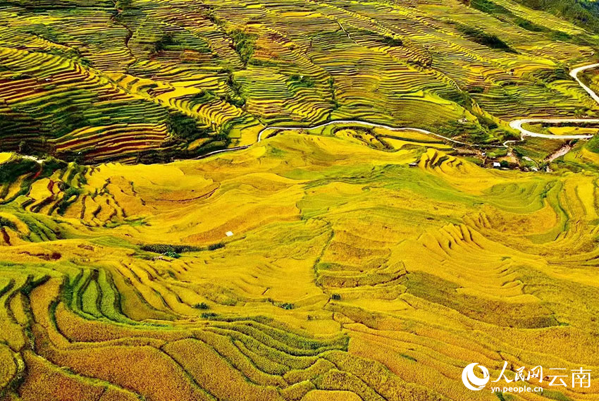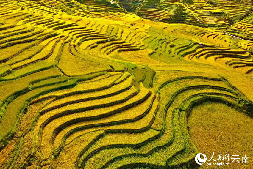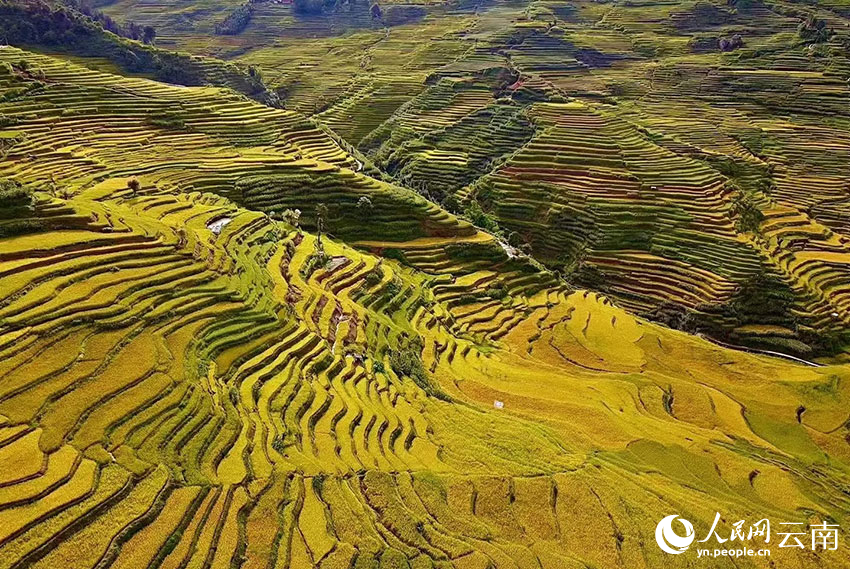 The Shier Longquan terraced fields in Honghe county, Honghe Hani and Yi Autonomous Prefecture, southwest China's Yunnan Province, burst with golden hues. (People's Daily Online/Li Ze'nyu)