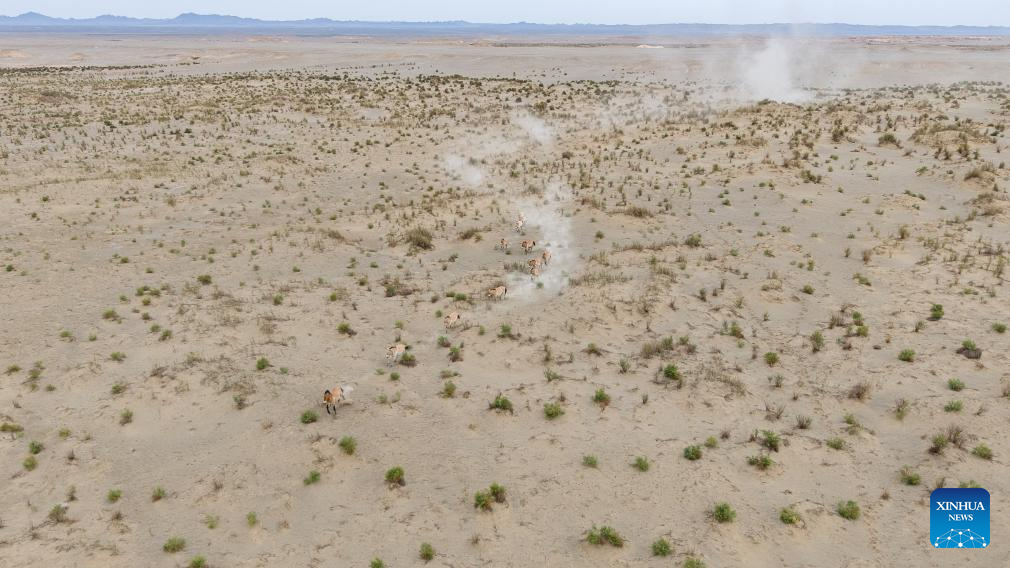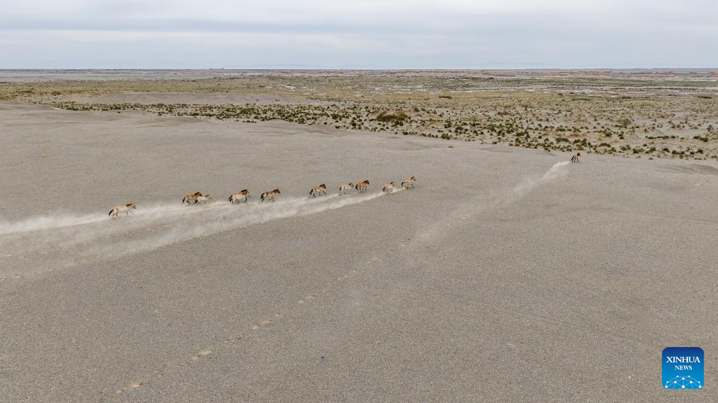 An aerial drone photo taken on Sept. 24, 2025 shows the Przewalski's horses in the Dunhuang West Lake National Nature Reserve, in Dunhuang, northwest China's Gansu Province. The Dunhuang West Lake National Nature Reserve in Gansu Province covers an area of approximately 660,000 hectares, featuring a diverse ecosystem including wetlands, grasslands, forests and Gobi deserts, which makes it an experimental zone for the wild release of the Przewalski's horses. (Xinhua/Lang Bingbing)