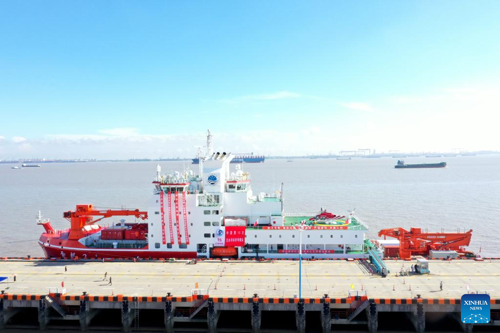 A drone photo taken on Sept. 26, 2025 shows China's research icebreaker Xuelong 2 berthed at a dock in Shanghai, east China, Sept. 26, 2025. (Xinhua/Liu Shiping)