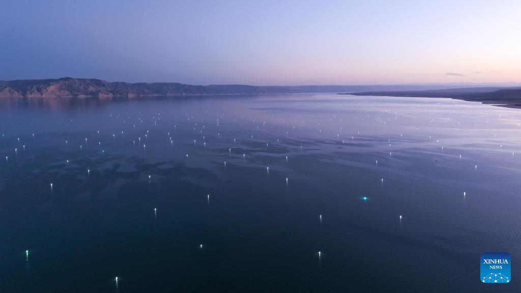 A drone photo taken on Oct. 17, 2025 shows fishing light attractors in the Longyang Gorge area in Gonghe County of Hainan Tibetan Autonomous Prefecture, northwest China's Qinghai Province. Each year from late August to late November, fishermen in Longyang Gorge are busy harvesting silver fish.