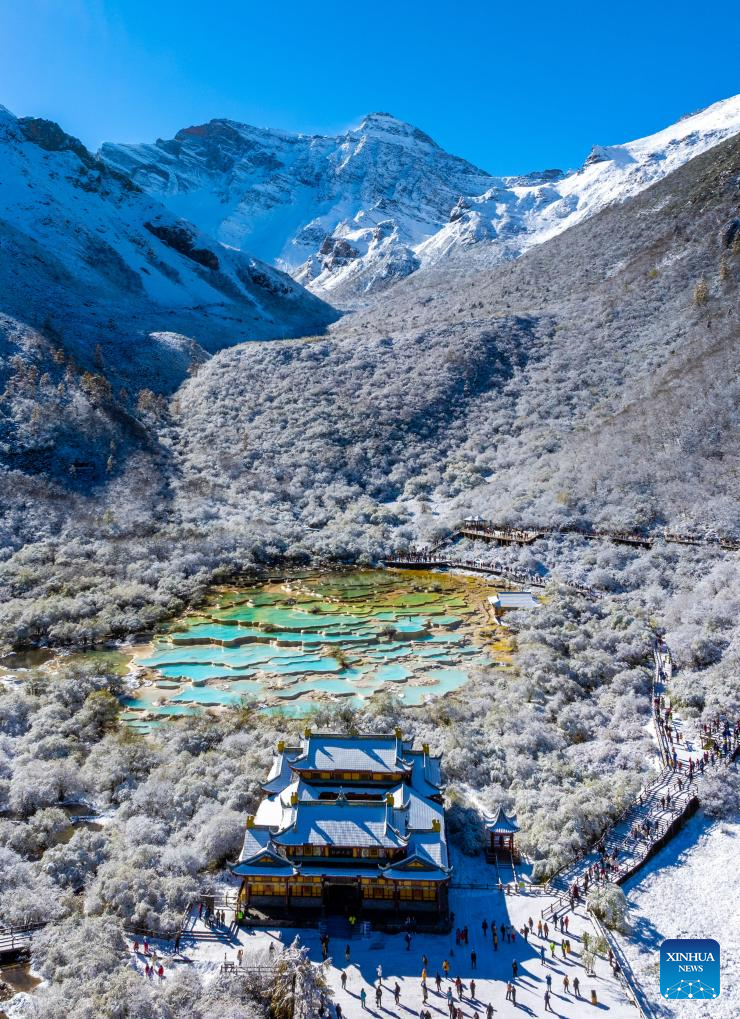 A drone photo taken on Oct. 21, 2025 shows a view of a colorful pond cluster after snow at the Huanglong scenic area in Aba Tibetan and Qiang Autonomous Prefecture, southwest China's Sichuan Province.