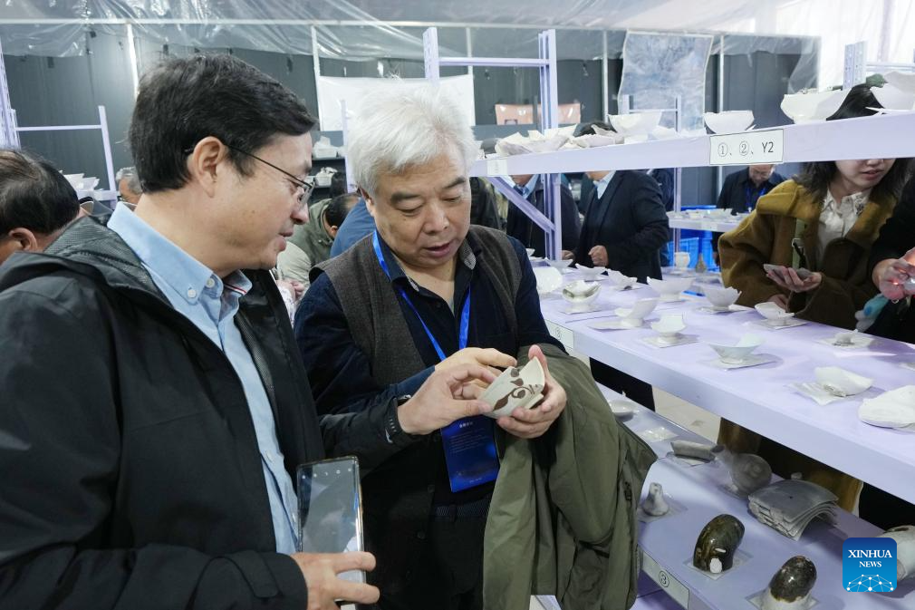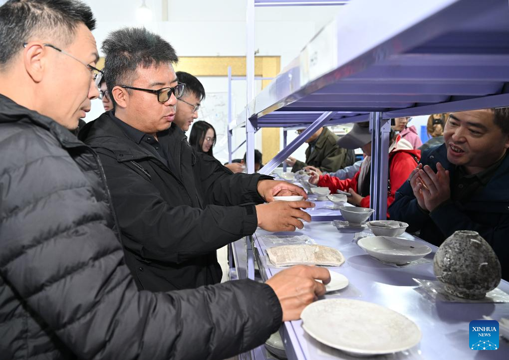Archaeologists view samples of excavated porcelain at the cultural relics storage room of the archaeologist team working on the remnants of the Suyukou kiln, in Yinchuan, capital of northwest China's Ningxia Hui Autonomous Region, Oct. 13, 2025. Remnants of the Suyukou kiln were discovered in 2017 in Yinchuan, capital of Ningxia, and cover an area of roughly 40,000 square meters. (Xinhua/Wang Peng)