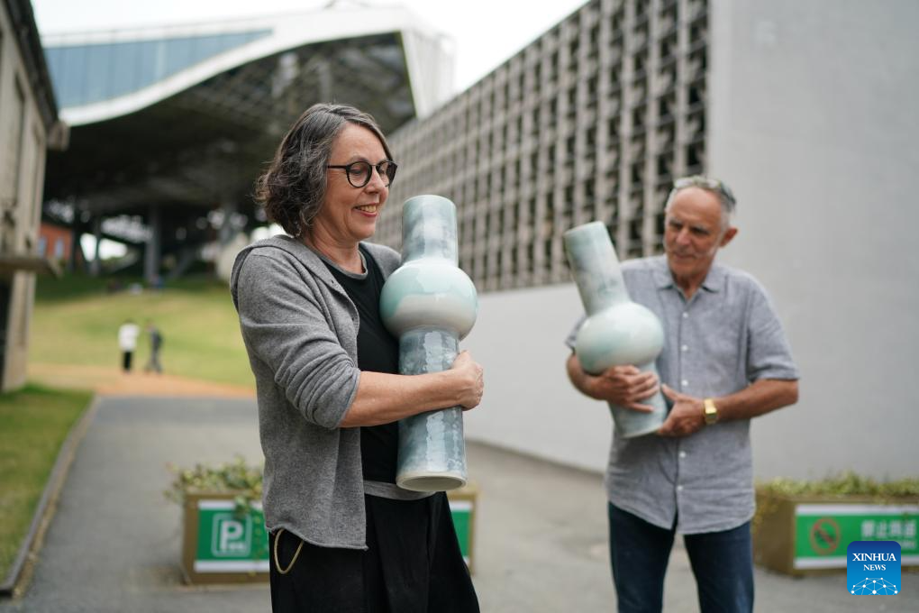 Christiane Toewe (L) and her husband transfer ceramic works in Jingdezhen City, east China's Jiangxi Province, Oct. 19, 2025. (Xinhua/Zhou Mi)