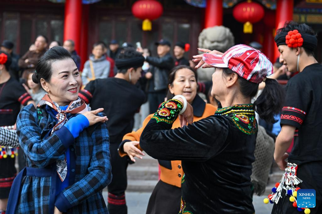 Performers from a Yunnan dance and opera troupe perform during a flash mob event at Renmin park in Urumqi, northwest China's Xinjiang Uygur Autonomous Region, Oct. 27, 2025. A flash mob event featuring ethnic dances was held here on Monday. (Xinhua/Ding Lei)