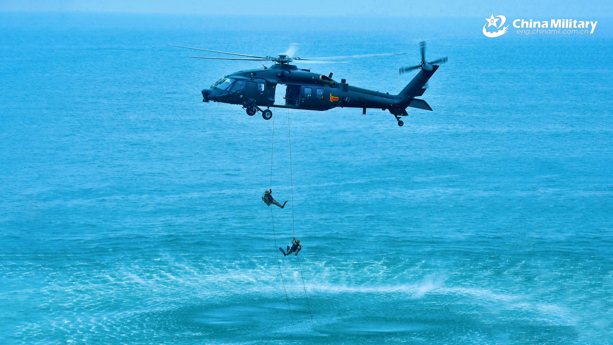 Assault troops attached to a brigade under the Chinese PLA Eastern Theater Command successively fast-rope from a Z-20 helicopter during a multi-subject flight training exercise on September 12, 2025. (eng.chinamil.com.cn/Photo by Zhang Mao)