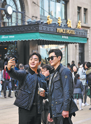 South Korean tourists take pictures in front of the renowned Peace Hotel in Shanghai on Nov 30 last year. CHEN HAOMING/XINHUA