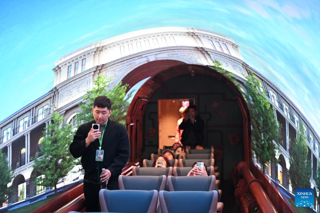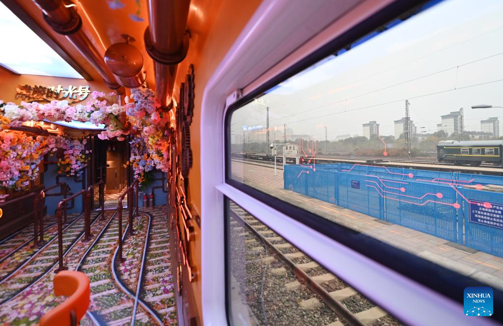 This photo taken on Oct. 30, 2025 shows a scene inside a themed carriage of the Tianjin Fantasy Express train in north China's Tianjin. The Tianjin Fantasy Express, China's first passenger train dedicated to immersive cultural tourism, officially began operation on Thursday. The train features 10 distinctively themed carriages and song and dance performances. It currently operates on a scheduled round-trip service between Tianjin North Railway Station and Jizhou North Railway Station. (Xinhua/Li Ran)
