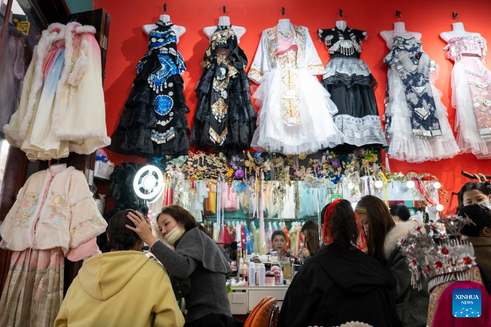 Tourists have their makeup applied at a travel photography studio on the ancient street in Yangloudong of Chibi City, central China's Hubei Province, Oct. 29, 2025. Yangloudong has long been renowned as the hometown of brick tea and is one of the starting points of an ancient tea road. In recent years, the area has built a new tourism model to attract tourists by creating intangible cultural heritage themed blocks and introducing diversified business formats such as Hanfu-renting and photograph. (Xinhua/Wu Zhizun)