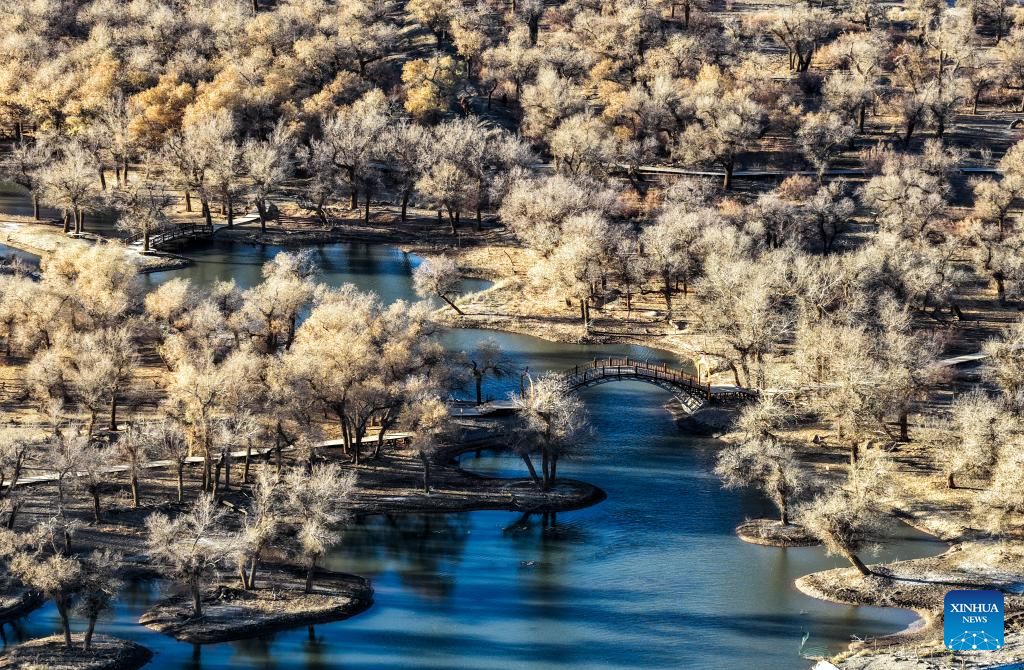 An aerial drone photo taken on Oct. 30, 2025 shows the scenery of a populus euphratica forest in Ejina Banner, north China's Inner Mongolia Autonomous Region. (Xinhua/Lian Zhen)