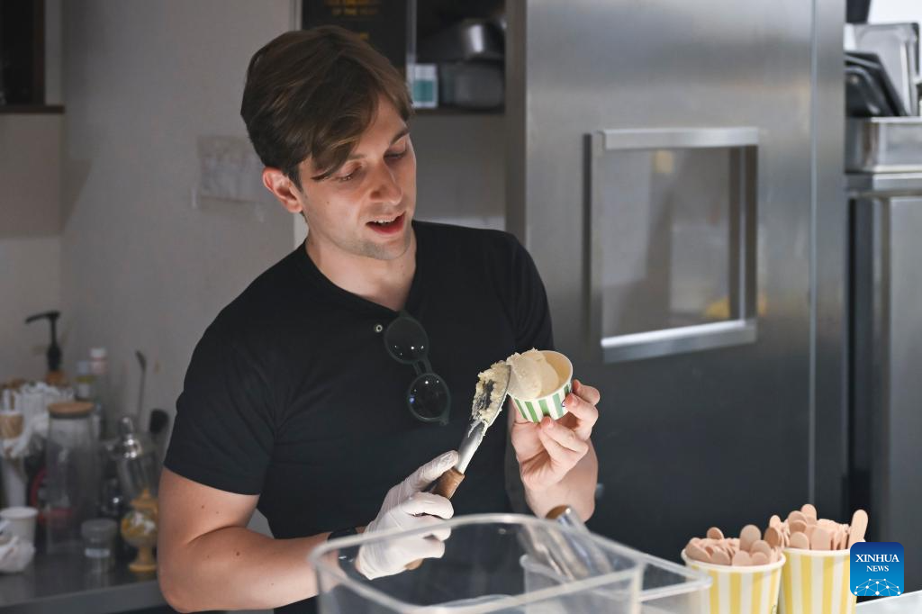 Alessandro Conti displays an ice cream at his gelato shop in Shanghai, east China, Sept. 30, 2025. (Xinhua/Chen Haoming)