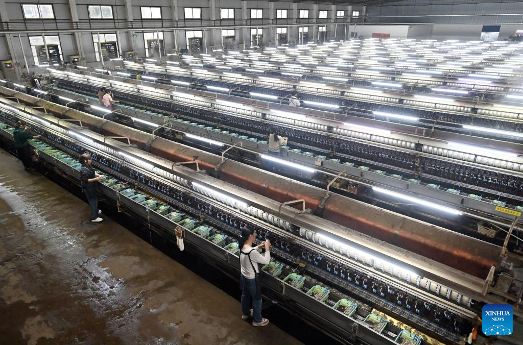 A worker is busy at a silk factory in Xincheng County of Laibin, south China's Guangxi Zhuang Autonomous Region, on Nov. 4, 2025. Xincheng County of Guangxi, boasting a long history of mulberry planting and silkworm raising, has endeavored to extend the silkworm industry chain in recent years. The silkworm industry has boosted the growth of local income and enriched farmers. (Xinhua/Lu Boan)