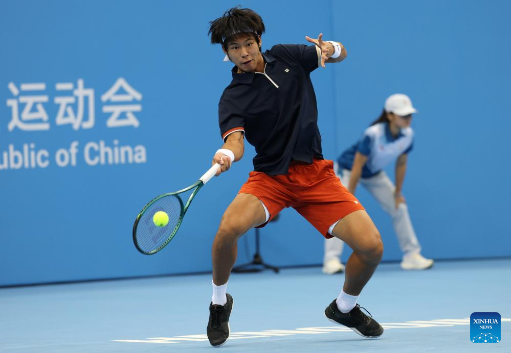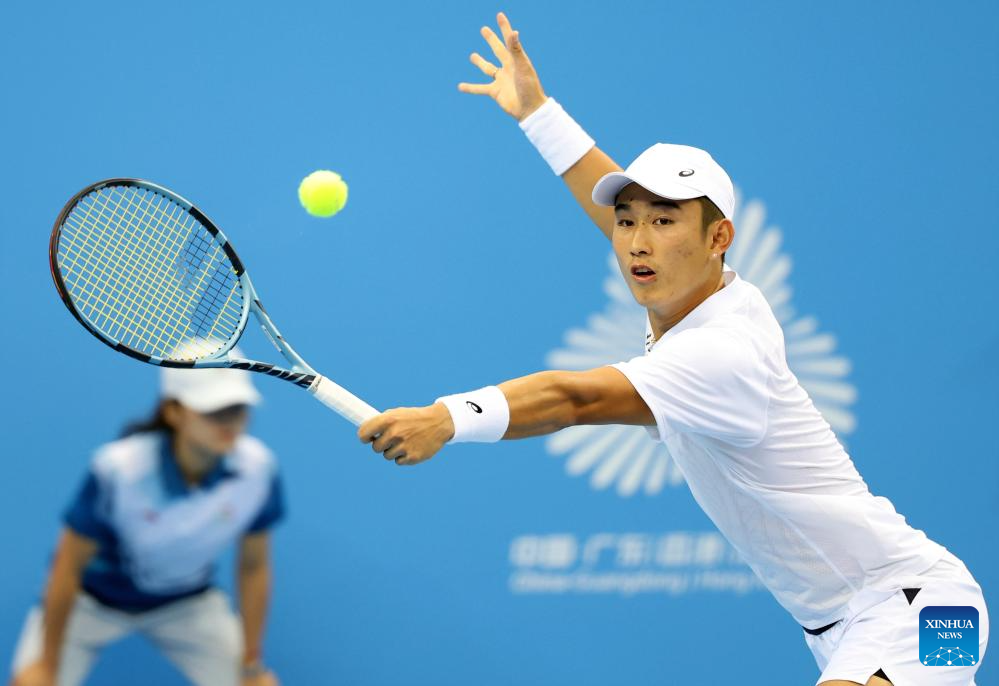 Shang Juncheng of Beijing competes against Zhou Yi of Guangxi during the junior men's team semifinal match between Beijing and Guangxi at China's 15th National Games in Hengqin, south China's Guangdong Province, Nov. 11, 2025. (Xinhua/Zhang Chenlin)