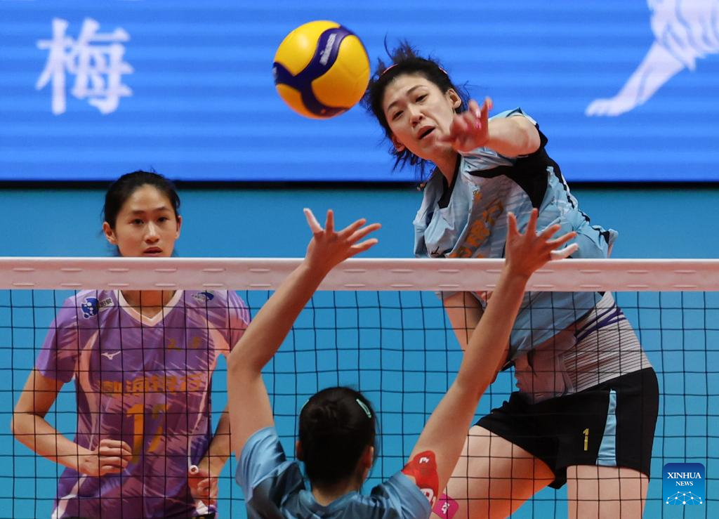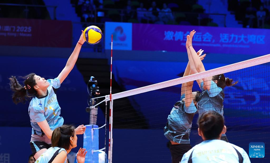 Li Yingying (top) of Tianjin competes during women's volleyball group A match between Tianjin and Sichuan at China's 15th National Games in Macao, south China, Nov. 11, 2025. (Xinhua/Sun Fanyue)