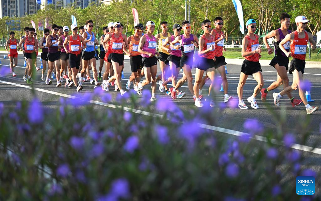 Athletes compete during the men's 20km race walk of athletics at China's 15th National Games in Zhuhai, south China's Guangdong Province, Nov. 12, 2025. (Xinhua/Lian Zhen)