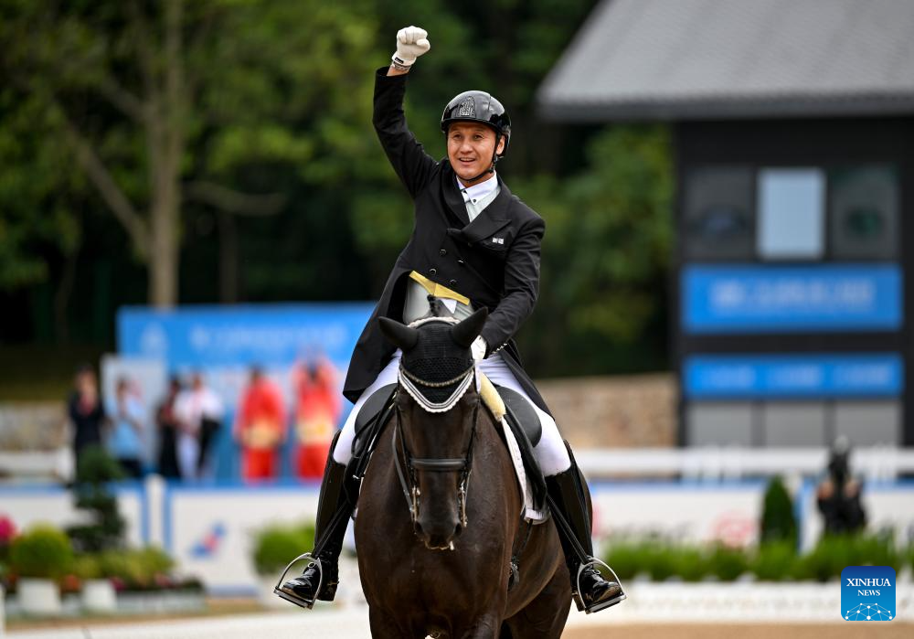 Liu Tao of Xinjiang celebrates after the equestrian dressage individual final at China's 15th National Games in Shenzhen, south China's Guangdong Province, Nov. 12, 2025. (Xinhua/Feng Kaihua)