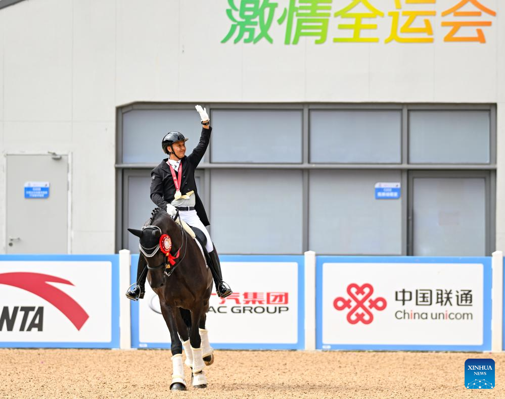 Gold medalist Liu Tao of Xinjiang celebrates after winning the equestrian dressage individual final at China's 15th National Games in Shenzhen, south China's Guangdong Province, Nov. 12, 2025. (Xinhua/Feng Kaihua)