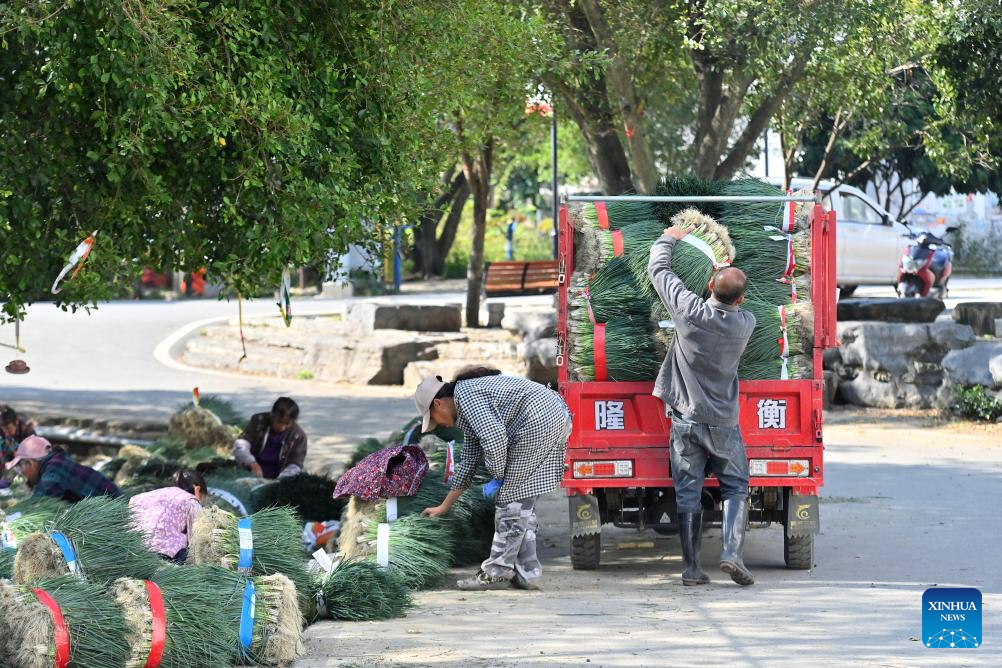 Villagers transfer chive bundles for sale in Jueshan Village of Sandu Town in Liuzhou City, south China's Guangxi Zhuang Autonomous Region, Oct. 28, 2025. Sandu Town has in recent years promoted the standardized and industrialized production of chives, and developed an integrated business system that ranges from planting and processing to sales and service. (Xinhua/Huang Xiaobang)