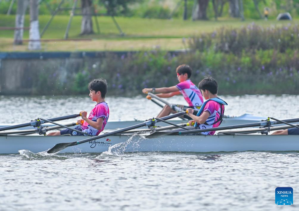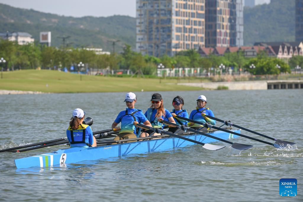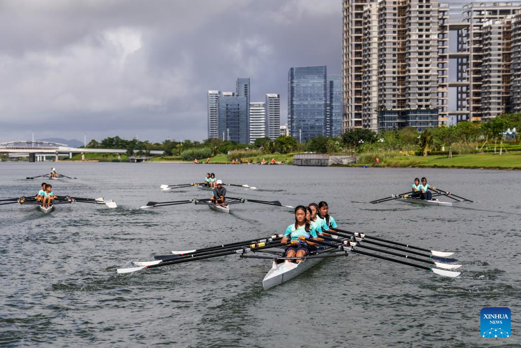 Trainees exercise rowing on the Tianmu River in Hengqin, south China's Guangdong Province, June 21, 2025. (Xinhua/Mao Siqian)