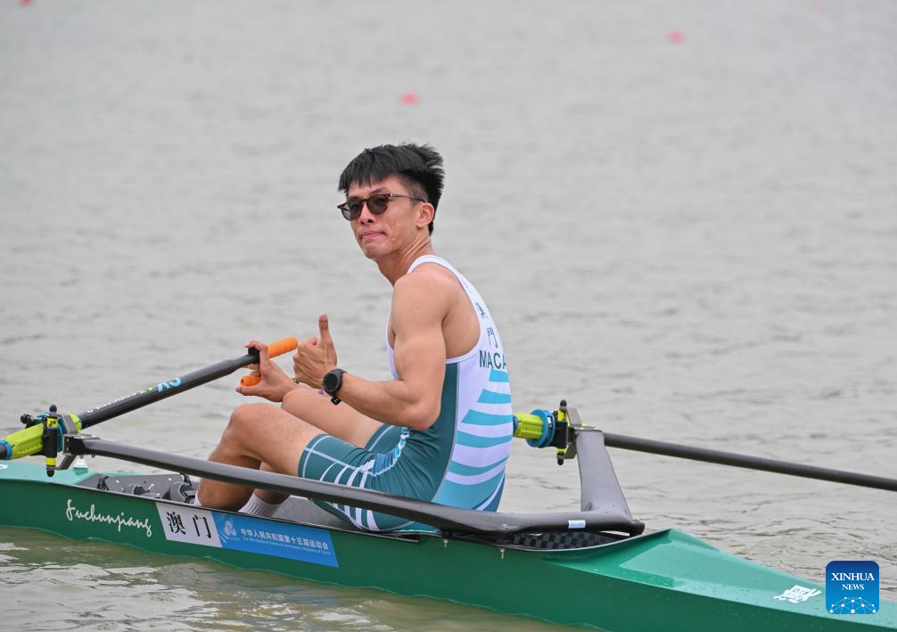Chu Ming Kun of Macao reacts after men's lightweight single sculls of rowing in Guangzhou, south China's Guangdong Province, Nov. 6, 2025. (Xinhua/Xiao Ennan)