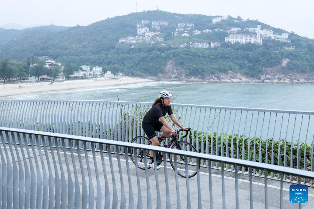 This photo taken on Oct. 29, 2025 shows Wong Wan Yiu riding by the sea in Shenzhen, south China's Guangdong Province. (Xinhua/Liang Xu)
